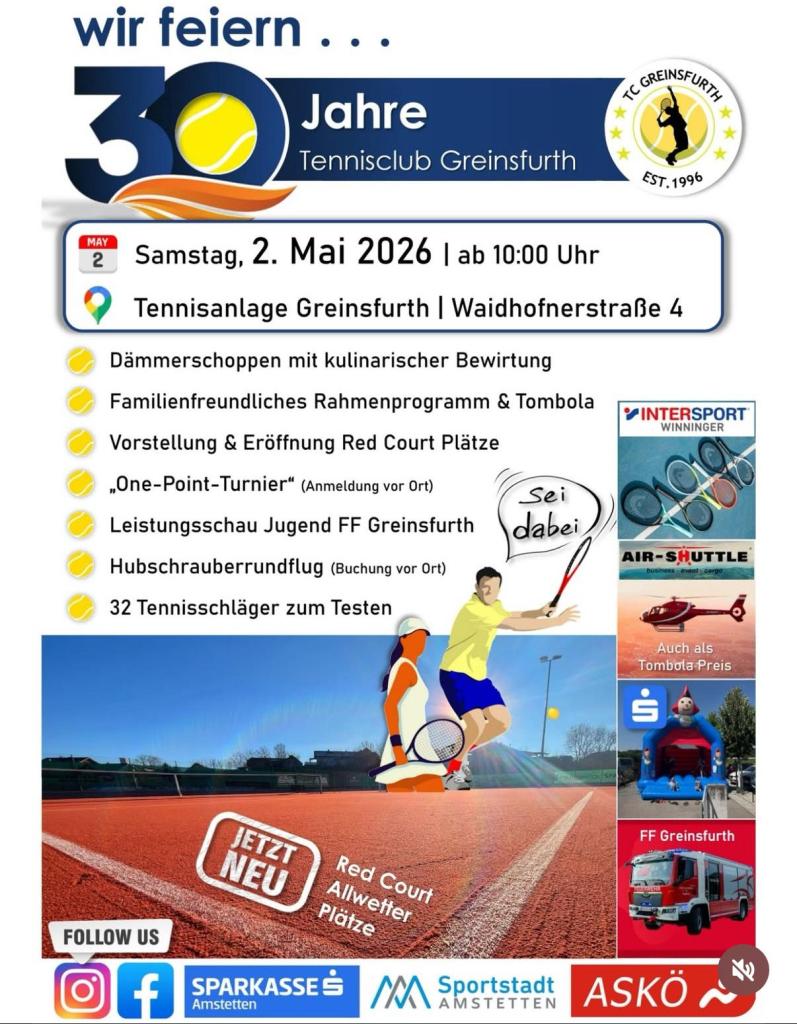 Der Tennisclub Greinsfurth feiert sein 30-jähriges Bestehen und lädt herzlich alle Mitglieder, Freunde des Vereins sowie Tennisinteressierte zur großen Jubiläumsfeier ein.